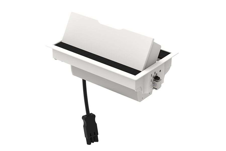 Indesq® Tesla inbouw stekkerdoos / vergaderunit wit 3-voudig - 2x WCD met penaarde schuin + 1x USB A-C charger / USB-lader (intern aangesloten) - kleur wit RAL9010 fijnstructuur met aluminium koker en wit schakelmateriaal - 2-zijdig / dubbelzijdig scharnierende klep met borsteldoorvoer - geleverd met bevestigingsmaterialen - inclusief aansluitkabel circa 80 centimeter met GST18/3 stekker - geschikt voor tafelbladen tot 37,5mm - ideaal voor vergadertafels - inbouw stopcontact - bureau stekkerdoos.