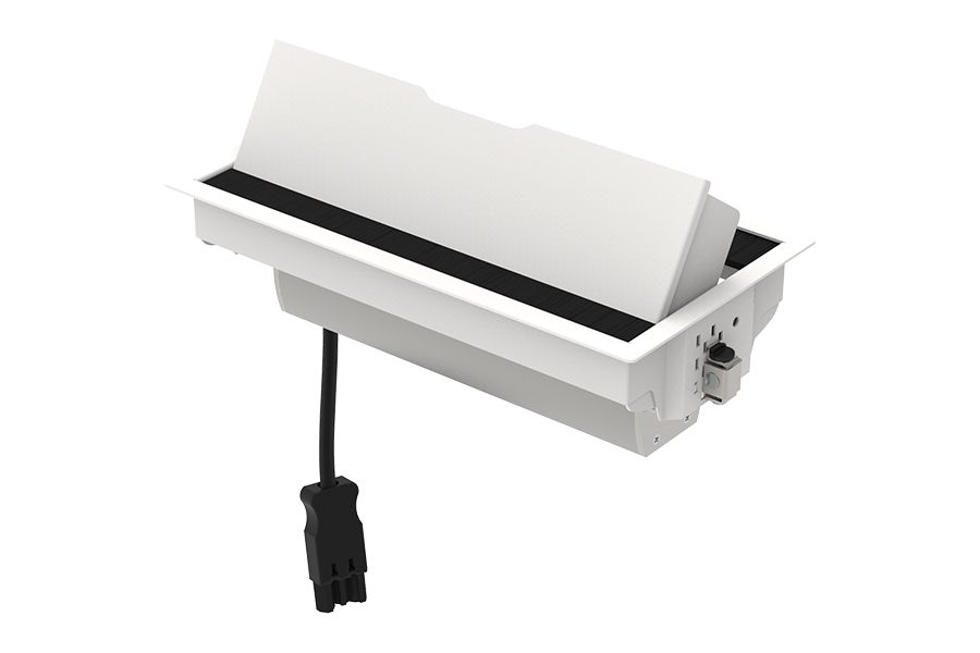 Indesq® Tesla inbouw stekkerdoos / vergaderunit wit 4-voudig - 2x WCD met penaarde schuin + 1x USB A-C charger / USB-lader (intern aangesloten) - kleur wit RAL9010 fijnstructuur met aluminium koker en wit schakelmateriaal - 2-zijdig / dubbelzijdig scharnierende klep met borsteldoorvoer - geleverd met bevestigingsmaterialen - inclusief aansluitkabel circa 80 centimeter met GST18/3 stekker - geschikt voor tafelbladen tot 37,5mm - ideaal voor vergadertafels - inbouw stopcontact - bureau stekkerdoos.